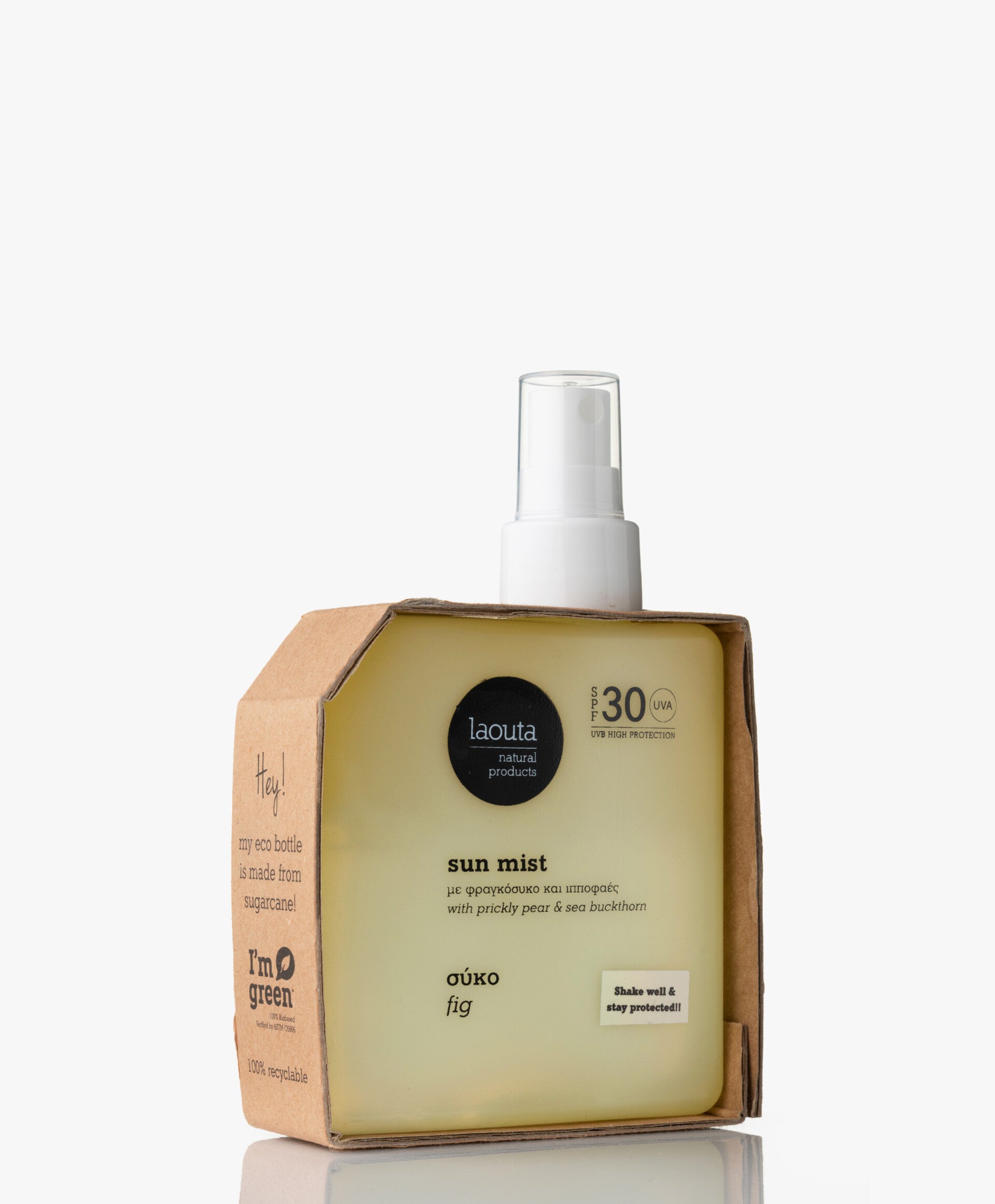 Laouta’s Sun Mist neemt je dankzij de heerlijke, zoete geur van vijgen mee naar Griekenland. De zonnebrandmist heeft een beschermende SPF 30 factor en is verrijkt met kruidenextracten en voedende oliën voor optimale hydratie en verzorging van de huid. De eco verpakking is gemaakt van suikerriet met een ‘I am Green’ certificaat - goed voor jou én de planeet!