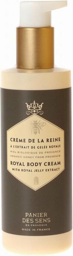 Deze royale body crème van Panier des Sens bevat Sheaboter, zoete amandelolie en biologische koninginnegelei (Royal Jelly). Een melk-witte substantie dat dient als voeding voor de bijenkoningin. Royal Jelly is bijzonder rijk aan mineralen, sporen-elementen, enzymen, eiwitten, vetten, suikers, vitamines én panthenol (vitamine B5). Sheaboter (Karité boter) is een natuurlijk vet onttrokken aan de noten van de Sheaboom, een typisch Afrikaanse savanne-boom, en is gekend voor haar verzachtende eigenschappen. Sheaboter bevat o.a. de essentiële vitaminen E, F en A en een zeer hoge dosis vetzuren. Vanwege al deze goede voedingsstoffen is zij zeer geschikt de vochtbalans in je huid te reguleren, de bloedcirculatie te verbeteren en de elasticiteit van je huid te bevorderen. Dankzij de zachte, boterachtige textuur wordt ze snel door je huid opgenomen. Zoete amandelolie is een milde olie en komt voort uit de eerste koude persing van amandelnoten en is rijk aan vitaminen, onverzadigde vetzuren, mineralen en oligo-elementen. Net als Sheaboter kent amandelolie een voedende werking, verlicht het huidirritaties, trekt snel in en reguleert het het vochtgehalte in je huid. Een mengeling van actieve en voedende stoffen dus die de celvernieuwing bevordert en de huid revitaliseert. Geschikt voor alle huidtypes, zelfs de meest gevoelige.